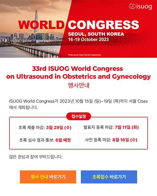 학술행사 2023 ISUOG World congress 일자 : 2023.10.15 ~ 2023.10.19 장소 : 코엑스 2023 ISUOG World congress일시 : 2023년 10월 15일 (일) ~ 19일 (목) 장소 : 코엑스 대한산부인과초음파학회 목록
