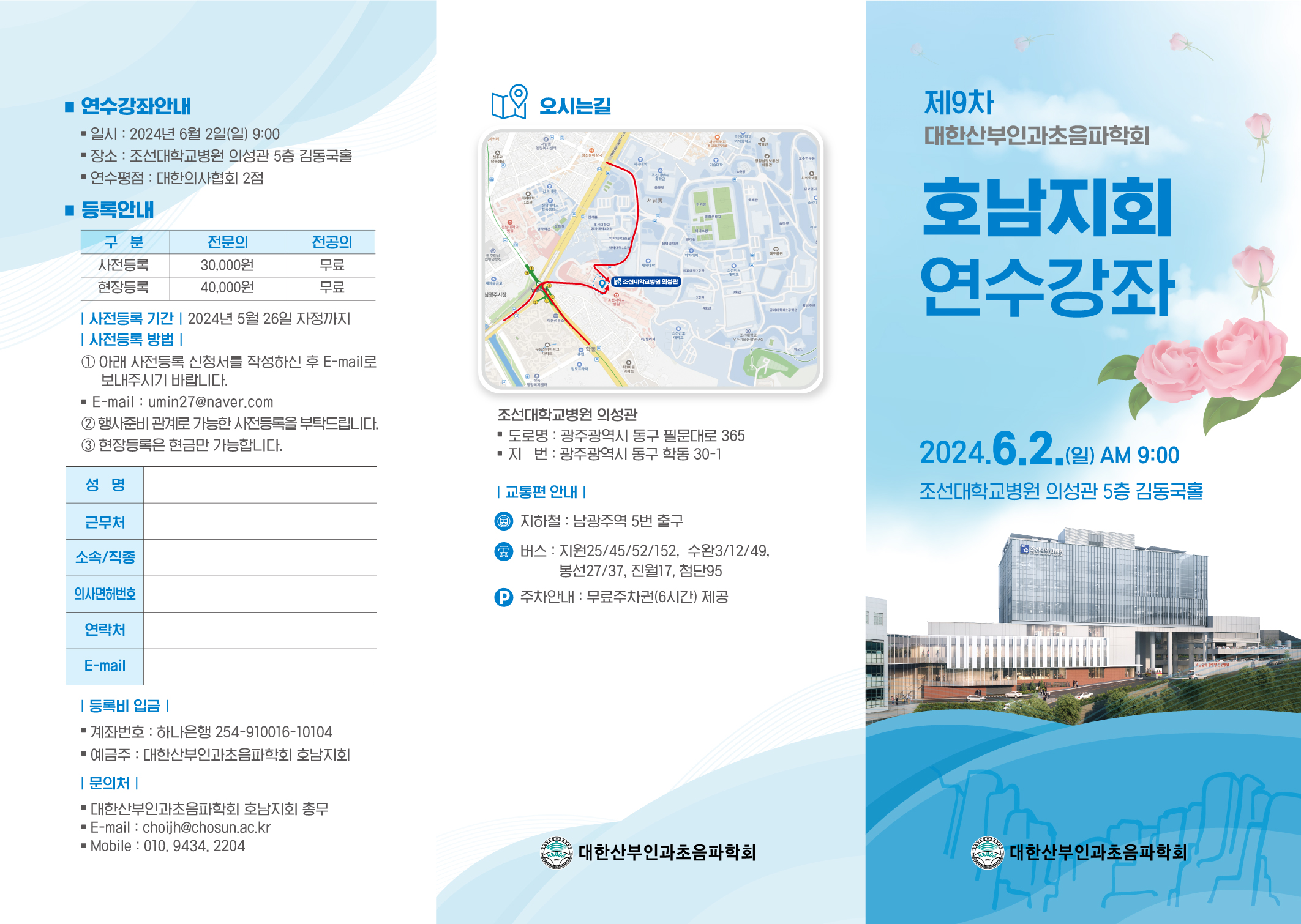 학술행사 제9차 대한산부인과초음파학회 호남지회 연수강좌 일자 : 2024.06.02 장소 : 조선대학교병원 의성관 5층 김동국홀 대한산부인과초음파학회 호남지회-리플렛-뒤.jpg (다운로드 : 53회) 대한산부인과초음파학회 호남지회-리플렛-앞.jpg (다운로드 : 53회) 목록