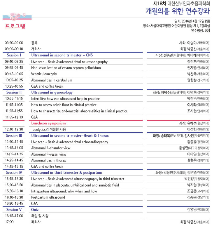 학술행사 연혁 제18차 대한산부인과초음파학회 개원의를 위한 연수강좌 및 제5차 대한산부인과초음파학회 산부인과초음파연구회 심포지엄 일자 : 2016.04.15 ~ 2016.04.16 장소 : 서울대학교병원 어린이병원 임상 제 1,2 강의실 http://old.ksuog.or.kr/workshop/201601/ 목록