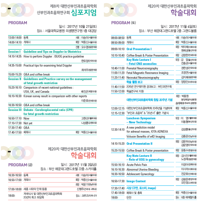 학술행사 연혁 제20차 대한산부인과초음파학회 학술대회 일자 : 2017.11.03 ~ 2017.11.04 장소 : 부산 해운대그랜드호텔 그랜드볼룸홀 http://old.ksuog.or.kr/workshop/201709/ 목록