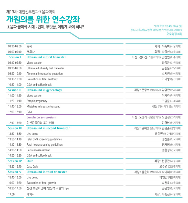 학술행사 연혁 제19차 대한산부인과초음파학회 개원의를 위한 연수강좌 제7차 대한산부인과초음파학회 산부인과초음파연구회 심포지엄 일자 : 2017.04.15 ~ 2017.04.16 장소 : 서울대병원 어린이병원 임상 제1,2강의실 http://old.ksuog.or.kr/workshop/201701/ 목록
