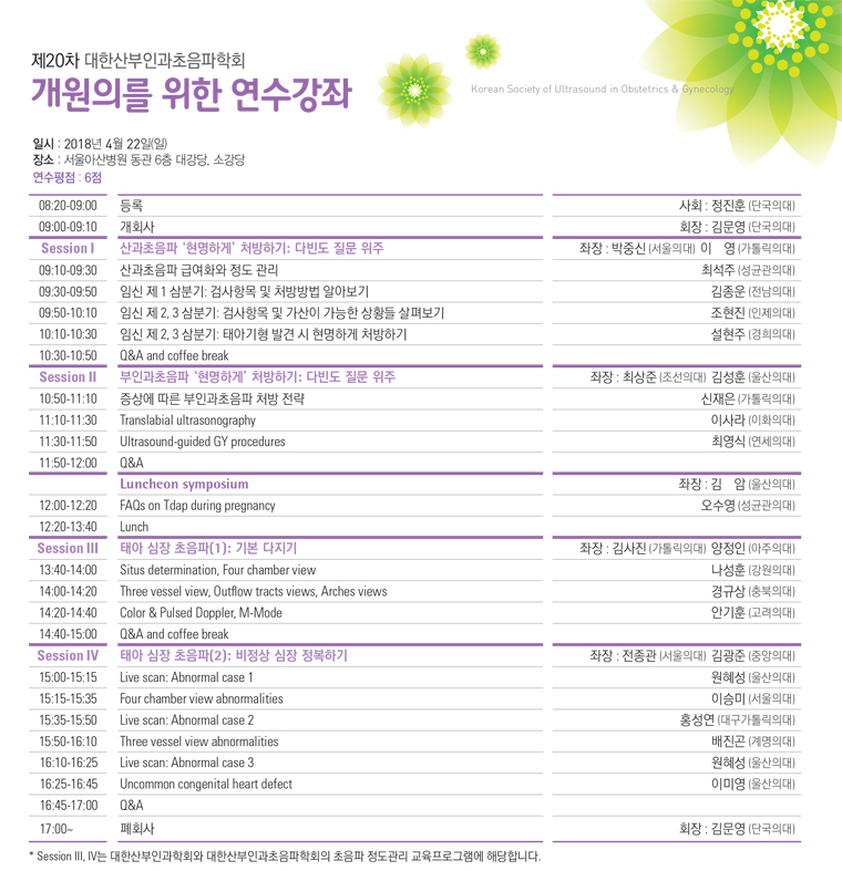 학술행사 연혁 제20차 대한산부인과초음파학회 개원의를 위한 연수강좌 일자 : 2018.04.09 장소 : 서울아산병원 동관 6층 대강당, 소강당 http://old.ksuog.or.kr/workshop/201801/ 목록