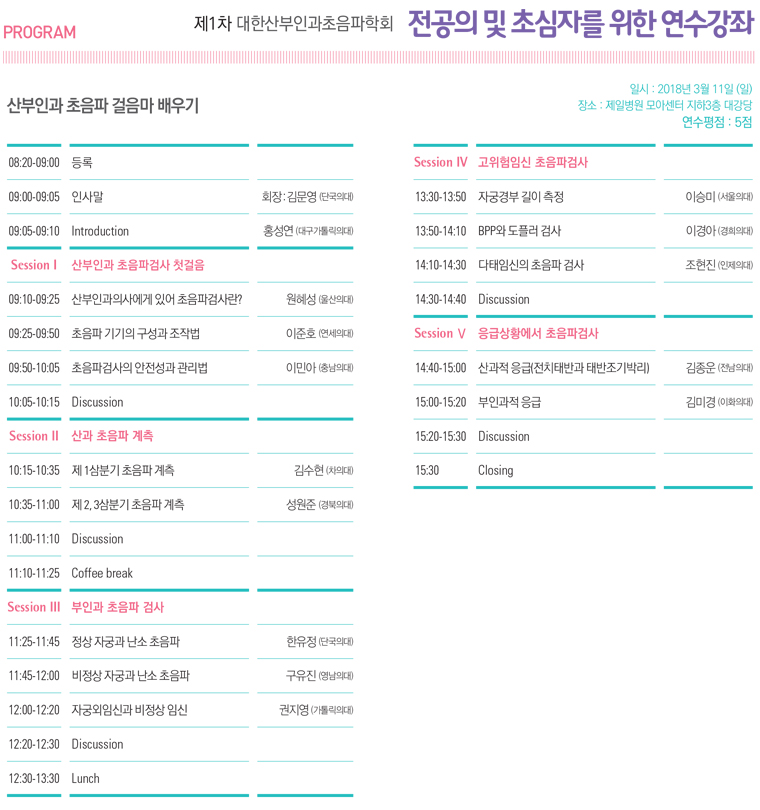 학술행사 연혁 제1차 대한산부인과초음파학회 전공의 및 초심자를 위한 연수강좌 일자 : 2018.03.11 장소 : 제일병원 모아센터 지하 3층 대강당 http://old.ksuog.or.kr/workshop/201805/ 목록