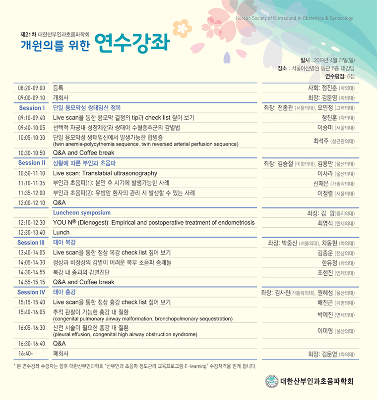 학술행사 연혁 제21차 대한산부인과초음파학회 개원의를 위한 연수강좌 일자 : 2019.04.21 장소 : 서울아산병원 동관 6층 대강당,소강당 http://old.ksuog.or.kr/workshop/201902/ 목록