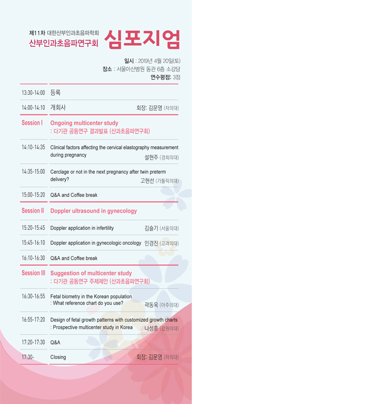 학술행사 연혁 제11차 대한산부인과초음파학회 산부인과초음파연구회 심포지엄 일자 : 2019.04.20 장소 : 서울아산병원 동관 6층 소강당 http://old.ksuog.or.kr/workshop/201902/ 목록