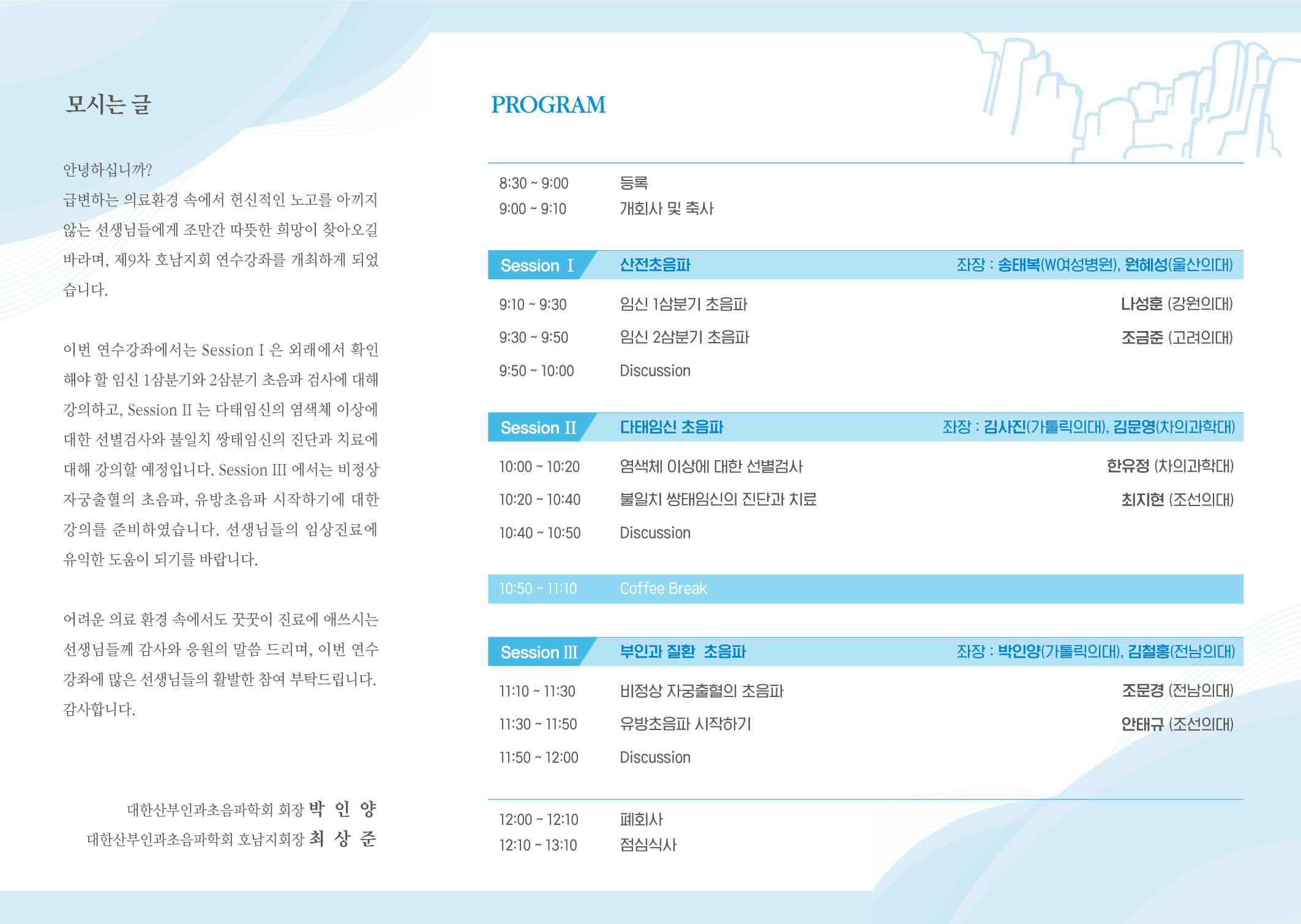 학술행사 제9차 대한산부인과초음파학회 호남지회 연수강좌 일자 : 2024.06.02 장소 : 조선대학교병원 의성관 5층 김동국홀 대한산부인과초음파학회 호남지회-리플렛-뒤.jpg (다운로드 : 53회) 대한산부인과초음파학회 호남지회-리플렛-앞.jpg (다운로드 : 53회) 목록