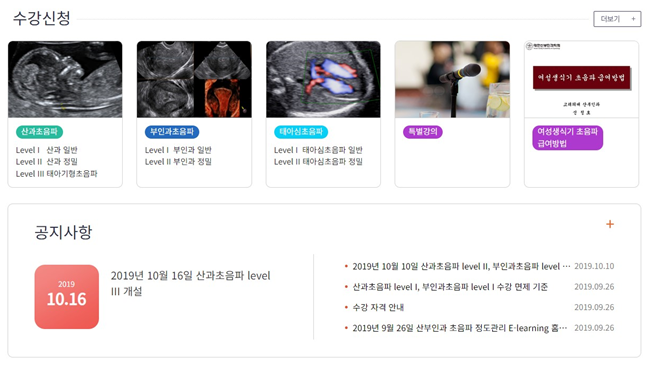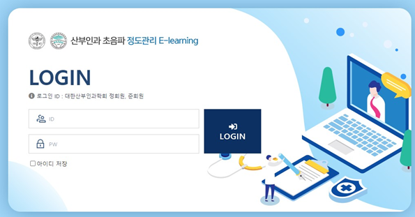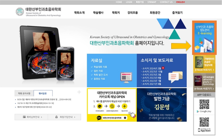 대한산부인과초음파학회 홈페이지에 접속하시면 우측 상단에 정도관리 E-learning을 확인할 수 있고 배너 클릭 후 대한산부인과학회 아이디와 비밀번호를 통해 접속하시면 수강신청을 통해 동영상 강의를 들을 수 있습니다.