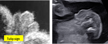 ①Hypospadias: urethral orifice의 위치가 비정상일 때를 일컫습니다. 초음파 소견으로, loss of the pointed tip of penis, abnormal ventral curvature of the penis, small penile shaft, tulip sign이 관찰된다면 의심할 수 있습니다.