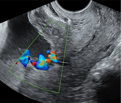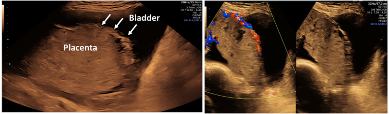 그림 1. Placenta accreta spectrum. 방광벽에 인접한 태반(왼쪽)과 불규칙한 uterovesical interface 및 placenta lacunae가 관찰(오른쪽). from ISUOG practice guidelines