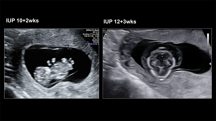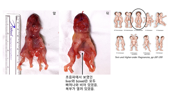 The initial ultrasonography showed weird extremities of the fetus. After that, the clinician diagnosed a conjoined twin with hydrops: one head, one heart, one liver, four arms, and four legs.